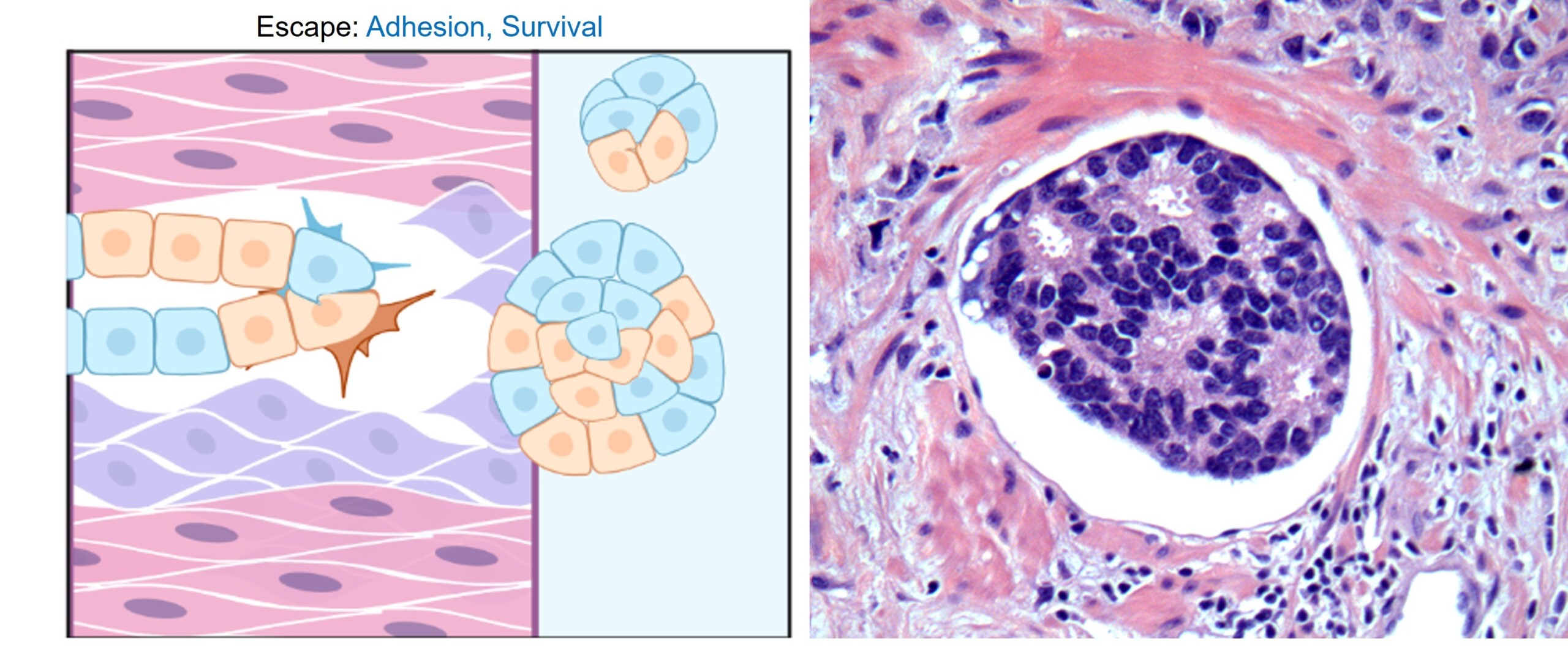 Tumor clusters escape the gland in stage T3a cancer. The image to the right shows a histological section of a PCa cluster within a vessel, which also requires penetrating the smooth muscle surrounding the vessel.