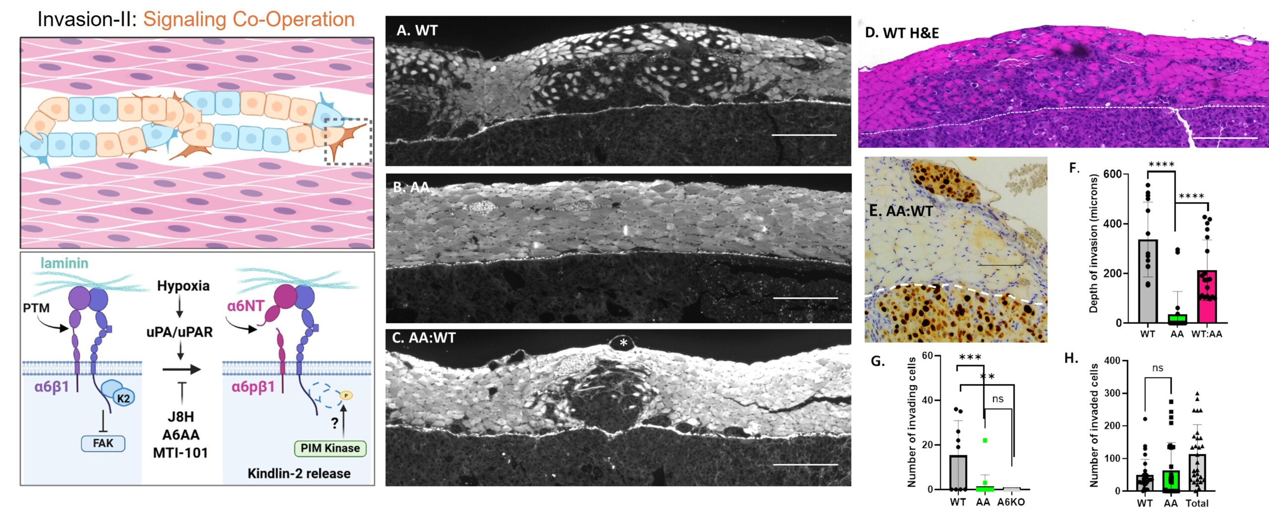 As tumor progression continues, signalling cooperation and heterogeneity drive muscle invasion of a specific phenotype in our mouse xenograft model. Tumor invasion of wild-type DU145 [WT] (A), and a mutant DU145 in which the α6 integrin cannot be clipped [AA] (B), and WT:AA (C) in a xenograft model by auto-fluorescence imaging of H&E (D is a section of A) tissue sections of mouse diaphragm. The depth of invasion (F), number of invading cells for each cell type, WT, AA, and A6KO (G), and number of cell types in a 1:1 mixture of WT and AA cells (H) was quantified using the entire diaphragm from three mice for each condition. (E) AA cells within the 1:1 WT:AA mixture breached the muscle barrier (white line) as detected by RFP-H2B reporter (brown nuclei).