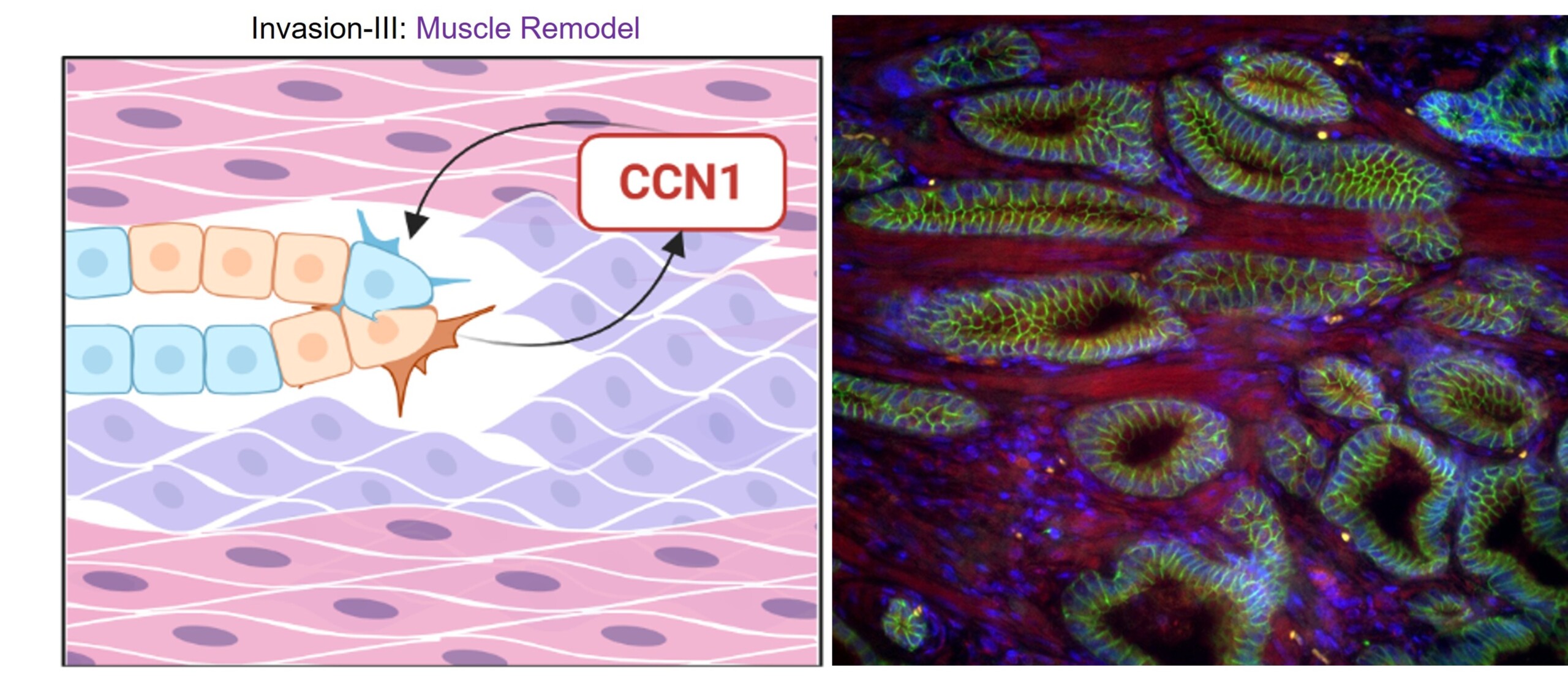 The final stage before metastasis is muscle invasion of the pseudo-capsule surrounding the human prostate organ (not present in mouse models) and CCN1/CYR61 is a known marker of muscle remodeling. The image to the right shows cohesive tumor clusters in a PCa biopsy. Invasion into and through the smooth muscle (desmin, red) occurs as PCa cells arrange themselves in clusters that maintain their cell-cell interactions (E-Cadherin, green; DAPI, DNA, blue).